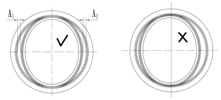 4.柔輪裝入剛輪中時(shí),檢查輪齒嚙合是否對(duì)稱,短軸上間隙應(yīng)相等,即A1=A2,如下圖所示。