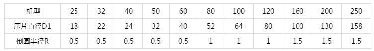 壓片直徑及倒圓半徑的許用值(單位:毫米)
