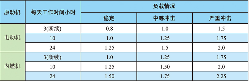 2、然后計(jì)算輸出扭矩,根據(jù)負(fù)載情況確定工況系數(shù)后確定輸出扭矩,選擇機(jī)型大小。工況系數(shù)如下表: